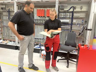 Logisches Denken, technisches Interesse und gute Noten in den MINT-Fächern, das sind für Ausbilder Benjamin Djawanshiri ideale Bedingungen für angehende Fachkräfte. Und Neugier. „Ich habe jeden Tag so viele Fragen“, sagt Celine Detering. Längst nicht in jedem Unternehmen sind die Auszubildenden so in den Produktionsablauf eingebunden, das weiß sie aus Gesprächen in der Berufsschule.