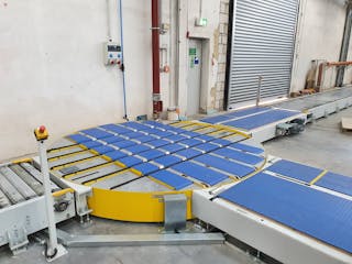 Weiterhin können Winkelübergaben auch auf Drehscheiben montiert werden, was jegliche Änderungen der Transportrichtung auf engstem Raum ermöglicht.