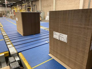 Kunststoffkettenförderer finden Einsatz zum schonenden Transport von Wellpappenstapeln, ob als Fertigware auf Paletten, aber auch palettenlos.
