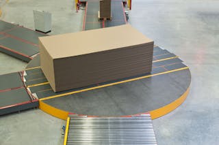 In the discharge area behind the corrugator the system exactly defines how and in which order and sequence the corrugated cardboard stacks reach the intermediate storage and the converting machines with an optimal utilization of the transport capacity.