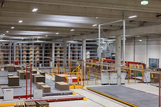 For the equipment of its new plant, TRICOR decided on MINDA as complete provider of intralogistics from a single source. Together, they developed a layout with intelligent material flow that is particularly space-saving and considers the large formats that are to be transported through the production halls in different orientations. TRICOR benefits from a single contact for the entire planning and execution of the project. Integrating the second level with converting machines transforms the system into a threedimensional structure: rather than relying solely on horizontal material flow, this vertically networked production layout optimizes space utilization, reduces throughput times, and supports a high degree of order complexity. This architecture exemplifies smart intralogistics in the corrugated board industry.