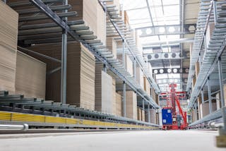 The inhouse storage solution ensures the perfect interaction with the corrugator by not only providing more storage space in a smaller area, but also by achieving more flexibility. The corrugator can pre-produce specific orders for the warehouse and is thus further decoupled from the converting machines. The single-deep storage within this warehouse allows direct access to each individual block.